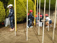 いよいよシートをかけていきます。2人で協力して、曲がらないようにシートを広げていきます。シートが風で動かないように、みんなで押さえます。2枚のシートが重なったら、動かないように留めていきます。