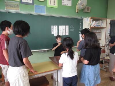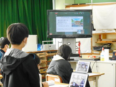2年生は、国語科「うれしくなることばをあつめよう」の授業で、話をつなぐことばを使って、グループで話し合いをしていました。話し合いを振り返ることができるよう、タブレットで録音して確認していました。