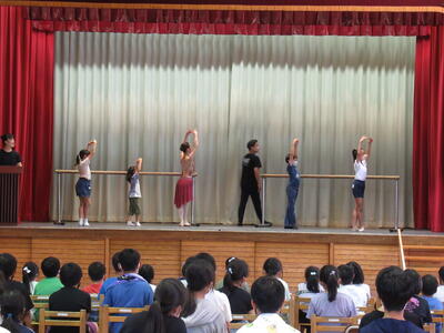今日は、文化庁「文化芸術による子供育成推進事業~巡回公演事業~」の一環として、一般財団法人「谷桃子バレエ団」のダンサー3名を講師として迎え、全校生参加のワークショップを実施しました。