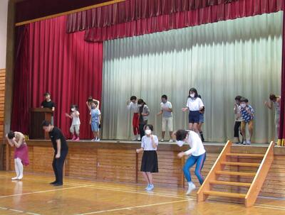 バレエのポーズで連続8回跳んだり、横に回転しながら進んだり、子どもたちはどんどん動きを覚えていきます。台詞の代わりにジェスチャーで示す「マイム」の動きもいくつか覚えました。