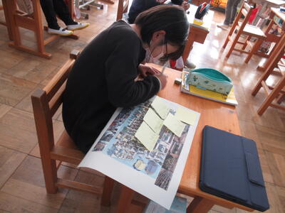記者さんから、新聞にまとめるためのポイントや手順の説明を聞きながら、今日は、「桃太郎」の鬼退治のことを記事にします。