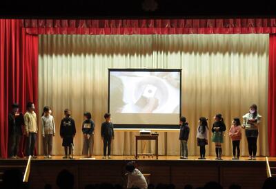 修了式の前に、今日でお別れになる先生の離任式を行いました。5年生の代表児童が、お別れの言葉を読み、1年生の代表児童が花束を渡しました。どの子も、離任する先生の顔をしっかりと見て、先生からのお別れのあいさつを聞いていました。