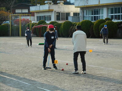 これは、「投げカーリング」です。砂袋を投げて得点を競います。