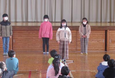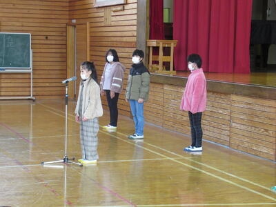 5年生の代表児童が、お別れの言葉を読み、4名の代表児童が花束を渡しました。4名の先生方とのお別れは寂しいですが、全員がお別れのあいさつを聞きながら、先生と過ごした楽しかった毎日を思い出しているようでした。先生方とのお別れの寂しさとともに、4月からの進学や進級に向けて、さらにがんばっていこうとする気持ちを持つこともできた離任式でした。