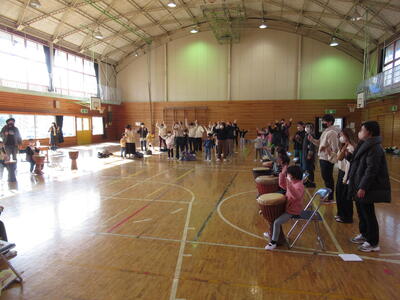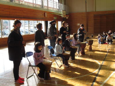 ひさを叩いて、リズムを確認したら、いよいよ太鼓を叩きます。まずは、子どもたちが太鼓で、2つのパートに分かれてリズムを叩き、保護者の皆様は、アフリカの様々な打楽器でベースのリズムを取ります。途中で、保護者の方が太鼓、子どもたちがアフリカの打楽器にと役割交代もして演奏しました。