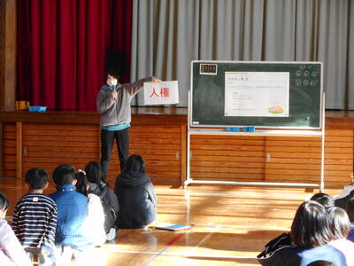 今日は、全校生で「なかよし集会」をしました。縦割り班である「ひいらぎグループ」で活動します。まず、ファシリテーターの先生から、「人権」とはどういうことなのかお話があり、今日のめあてと活動の流れの説明がありました。今日のめあては「みんなでなかよく生活するために、ほかの学年の友だちのことを知ろう」です。