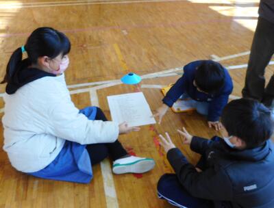 ウォークラリーの後は、みんなで楽しく仲間づくりゲームをしたり、ドッジボールをしたりしました。落合東小の友達とも仲良くなりました。