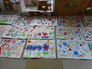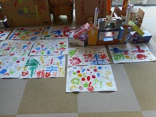 赤、青、オレンジ、緑、黄色の絵の具を野菜につけ、子どもたちは、思い思いに版画を作りました。