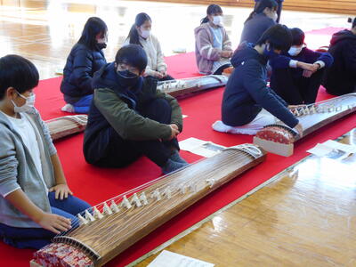 2校時は、5年生が箏や尺八について学んだり、箏に触れ、「さくらさくら」をみんなで演奏したりしました。