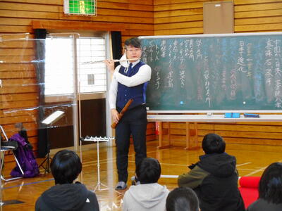 3校時は、6年生です。2年目の学習となるので、より深く学びます。尺八とフルートの違いについても、実演を交えながら教えていただきました。また、6年生は「越天楽今様」の演奏に挑戦しました。