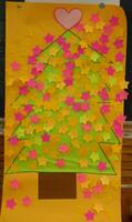 こんなににぎやかな、「あったか言葉」でいっぱいのツリーになりました!!あたたかい言葉でいっぱいのツリーなので、ハートの飾りをツリーのてっぺんに付けました。