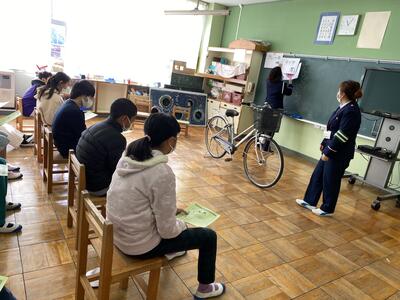 18日には、6年生対象に自転車教室が行われました。本来なら体育館で実際に自転車に乗りながら学ぶ予定でしたが、新型コロナウイルス感染拡大防止のため、一部内容を変更しました。