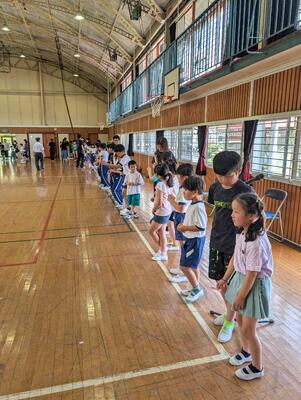 3~6年 お楽しみタイム。全員で中線ふみをします。