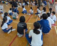 6年生が家庭教育学級で、救急救命の講習をしています。心臓マッサージを体験します。