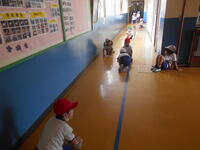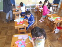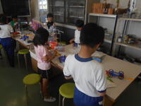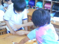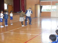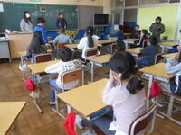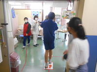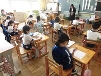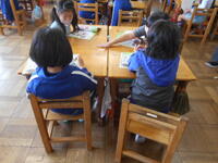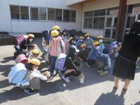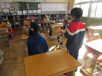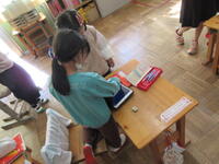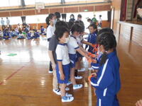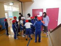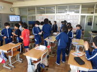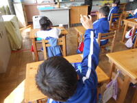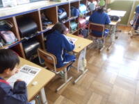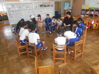 朝、「友だちタイム」。たてわり班で「あっち向いてホイ」「絵しりとり」などのミニゲームをして楽しみました。