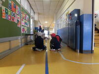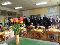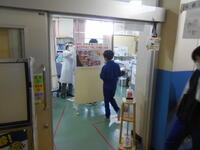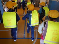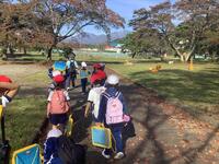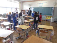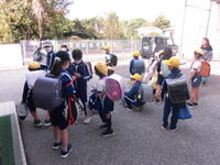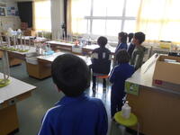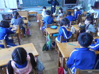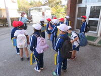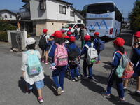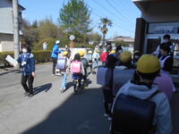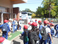 2年生活、今日は学校の周りのお店などを見学します。グループで見学先が違うので、保護者のボランティアに付き添ってもらいます。