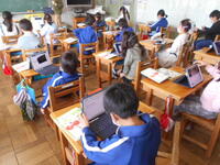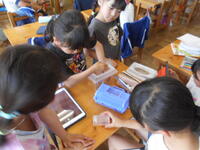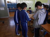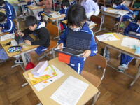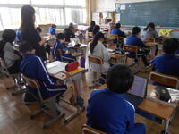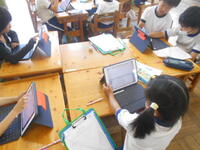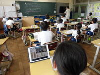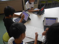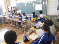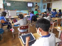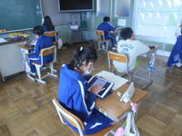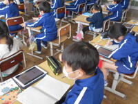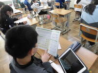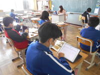 6年総合、ほかの人がタブレットでまとめた観光地のレポートを読んでいます。