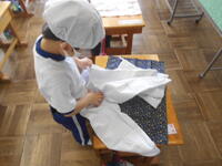 5年家庭、ぬい方の練習の前に、針に糸を通します。