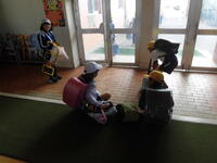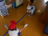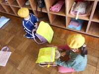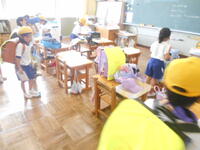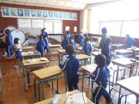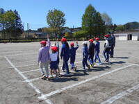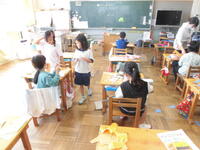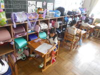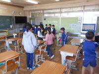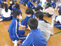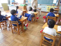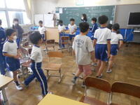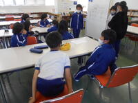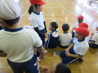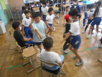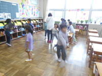 朝、友だちタイム、たてわり班でしりとりやフルーツバスケットをします。