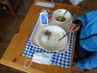 1年給食、白衣を着て、今日の分担を確かめて、配膳します。