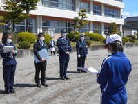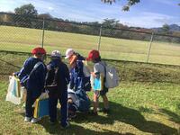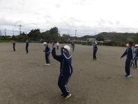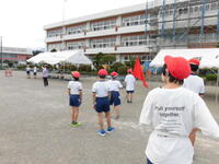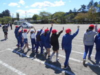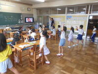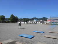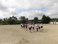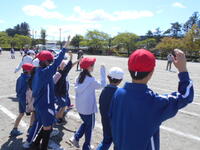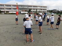 1、2年体育、学習が終わり体をふきます。良い天気でよかったです。