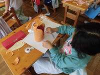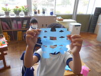 2年図工、版画です。型紙の周りを絵の具のついたスポンジでたたきます。