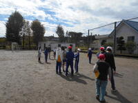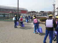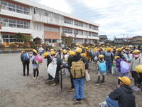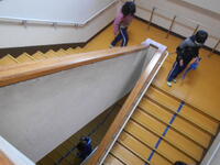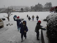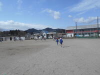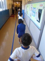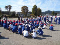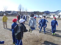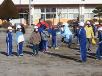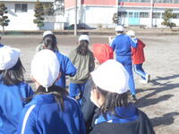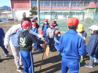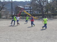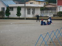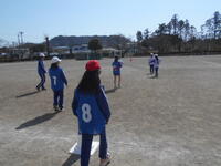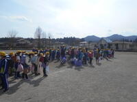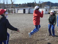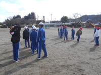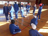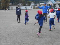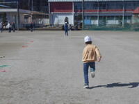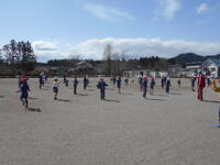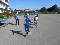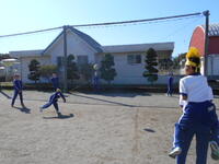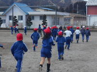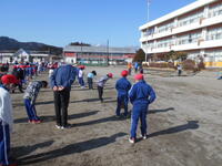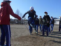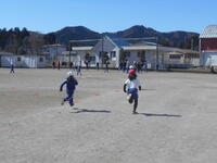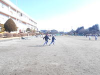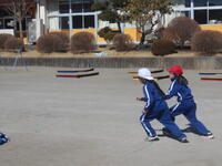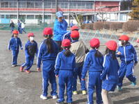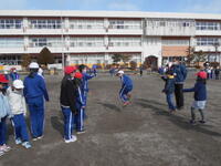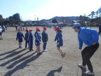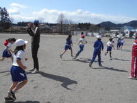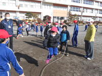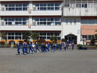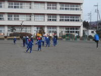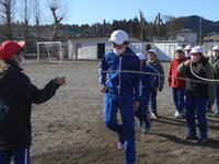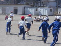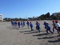 1・2年体育、なわとびの次に校庭を走りました。難しく言うとなわとびが「用具を操作する運動遊び」、無理のない速さで2~3分走るのが「体を移動する運動遊び」です。