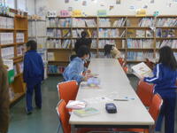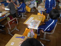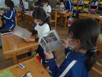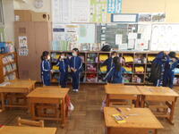 1年国語、図書室の本を初めて借ります。カードに書いて手続きします。