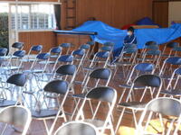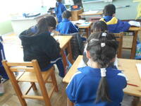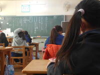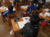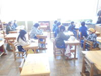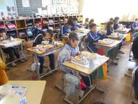 昼休み、2年生のかけ算九九チャレンジの時間です。ボランティアの方に聞いてもらいます。