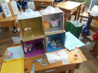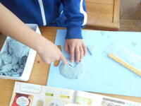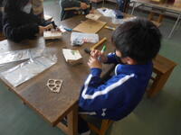 2年図工、粘土を握って感覚を楽しみながら形を作ります。部屋の中や、乗り物など思い思いに作ります。