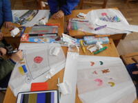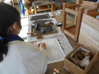 6年図工、版画です。黒インクで刷ったところに色づけをして仕上げます。