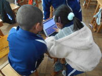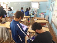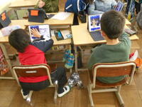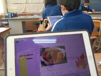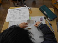 2年図工、タブレットで撮った画像をよく見て、顔に見えたものを絵に写し取ります。