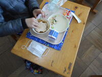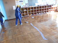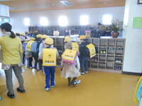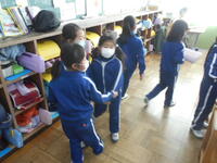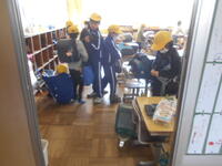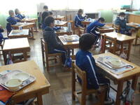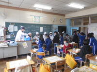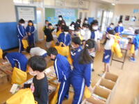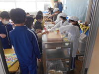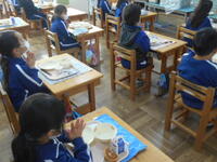 1年給食、白衣を着て、今日の分担を確かめて、配膳します。