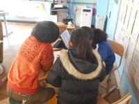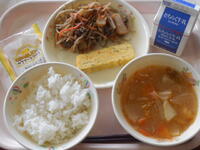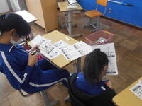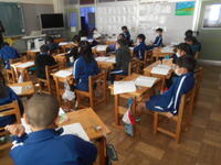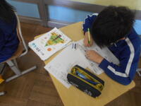 6年英語、新年の抱負を英語でまとめます。早く終わった人は、この前の発展学習で栄養バランスを考えたメニュー英語で説明します。おいしそうです。