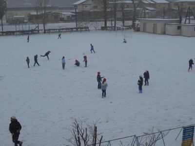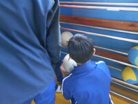 3年体育、キャッチバレーボールです。普通のルールは難しいので、相手から来たボールを一度キャッチして打ち返すことに変えています。楽しそうです。