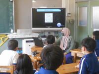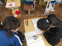 6年英語、「好きな国は?」「なぜ好きなの?」と、ペアでやり取りします。