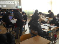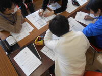 歯科校医の先生が歯の状態を読み上げます。担任が、記録用紙に書き写します。