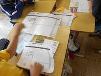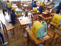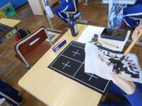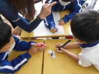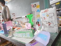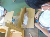 1年図工、工作をします。箱を組み合わせて何ができるかな。