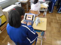 1年図工、箱を組み合わせて思いついたものを作りました。動物を作る人が多いですね。