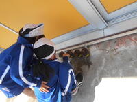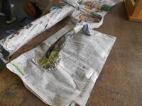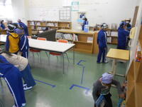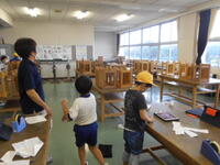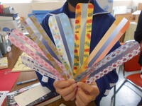 4年図工、新聞紙を細く丸め、棒にしたものを組み立てます。