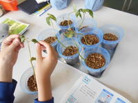 3年理科、明かりが点くように電池と豆電球をつなげています。ソケットを使わず豆電球に直接線をつなげますが、点きません。うまくいかない、どうして???が、とても大切です。