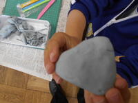 6年生が帰ってきました。資料館で勾玉作り体験をしました。自分で削った勾玉を見せてくれました。