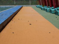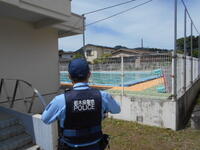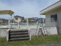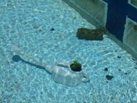 土日の間にプールがいたずらされました。砂利が投げ込まれ、水の底はたくさんの石やじょうろなどが沈んでいます。また、フェンスの一部が折り曲げられていました。