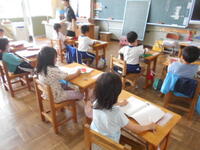 1年国語、ノートの使い方を確かめながら、今日の日付を書きます。