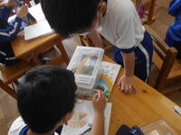 2年生活、校庭に出て見つけたり、捕まえたりした虫を見ています。観察カードに書きます。
