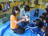 うさぎの正しい抱き方や食べさせてはいけないものなどを教わりました。ひとりずつうさぎを抱いたり心臓の音を聞いたりしました。かわいいうさぎに歓声を上げたり,心臓の速さに驚いたり楽しい時間を過ごしました。