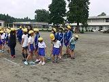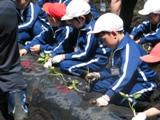 交通安全のお話を聞いた後に、登校班で模擬道路の歩行の訓練を行いました。