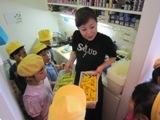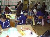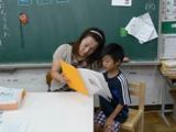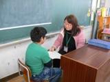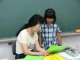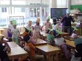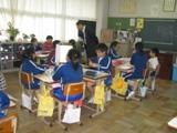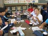 お面を作っています。ALTの先生と、英語指導助手の先生と