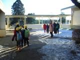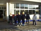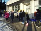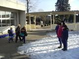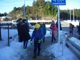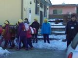【初日:雪の中学校前横断歩道で。運営委員会の子どもたち。】