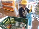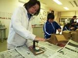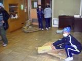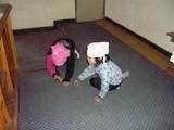 【床を水拭きする子どもたち】 【先生がワックスがけ】